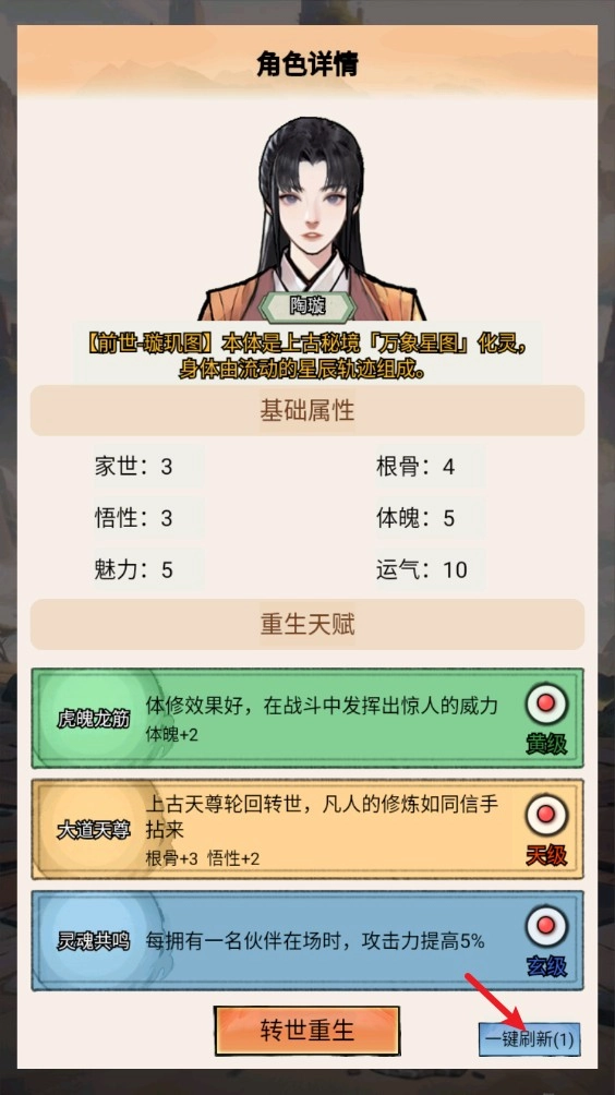 进入游戏后,我们要挑选自己的前世,右下角能刷新,找到合适的就能转世。