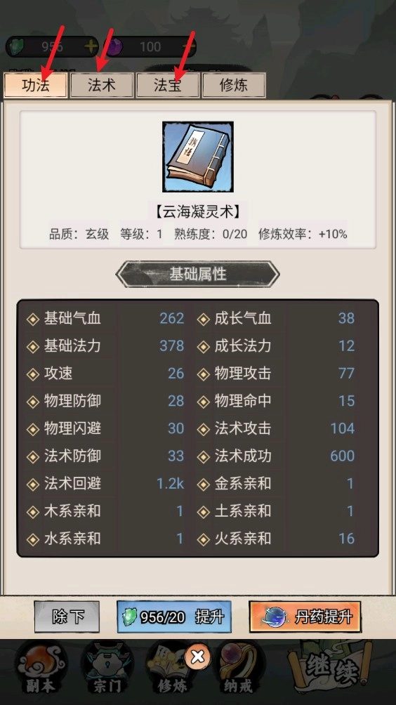 除此之外,还可以通过装备功法、法术、法宝来增强战斗力。