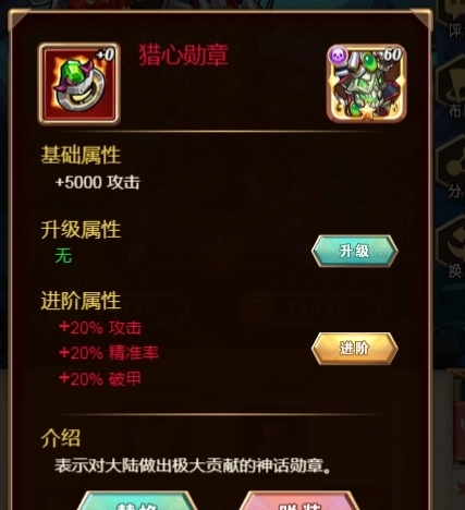 其次是勋章,勋章的培养包含升级与进阶两个方面,只有高品质的勋章(即紫、橙、红这三类勋章)能够开展进阶操作。和装备有所不同的是,勋章升级与进阶所需的材料都是勋章,具体是通过吞噬其他勋章来实现勋章的升级或者进阶。