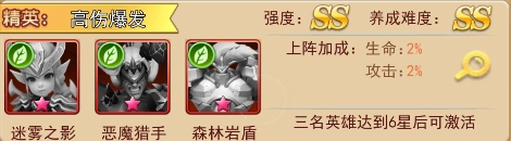 这套绿森阵容的组合堪称强力配置,展现出极强的进攻属性。恶魔猎手与迷雾之影都值得投入资源重点培养,其中前者拥有稳定的输出能力,后者则具备更突出的爆发伤害。