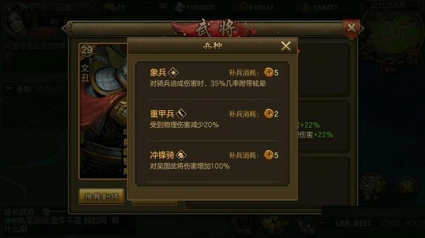 建议选择象兵作为兵种搭配:核心武将可选用输出能力突出的角色,该角色的高伤害特性使其对兵种的依赖度较低;若敌方为骑兵类武将,象兵的眩晕效果能有效限制对手;即便未遭遇骑兵,象兵自身也具备较强的兵种适配性,不易被敌方兵种克制。