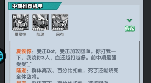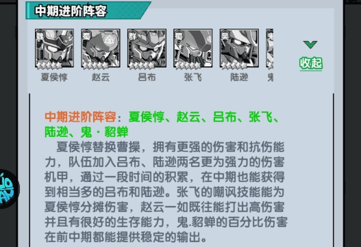 夏侯惇替代曹操,具备更出色的伤害输出与抗伤能力,队伍中新增吕布、陆逊这两台伤害更为强劲的机甲;经过一段时间的培养积累,在游戏中期也能获取到数量可观的吕布和陆逊。张飞的嘲讽技能可以为夏侯惇分担所受伤害,赵云依旧能够打出高额伤害且拥有良好的生存能力,鬼·貂蝉的百分比伤害无论是在前中期都能提供稳定的输出效果。