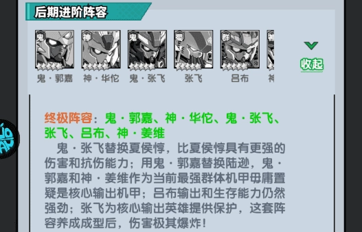 鬼·张飞替代夏侯惇,其伤害与抗伤能力均优于夏侯惇;鬼·郭嘉换下陆逊,鬼·郭嘉和神·姜维作为当下最强的群体机甲,无疑是核心输出机甲;吕布的输出与生存能力依旧强劲;张飞能为核心输出英雄提供保护,这套阵容养成成型后,伤害会极其爆炸!