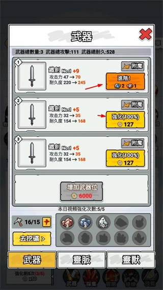 在武器界面进行强化与进阶操作,提升武器攻击力和耐久度,扩充武器持有数量,为战斗提供强力装备支撑。
