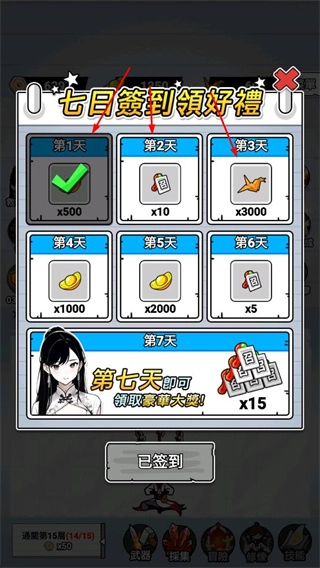 参与七日签到活动,每日领取奖励,为冒险战斗提供资源保障。