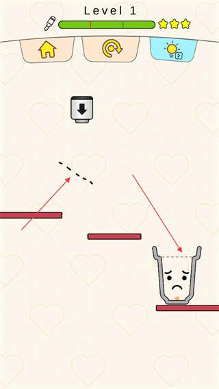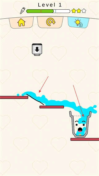 进入关卡后留意水滴的初始位置和杯子的摆放位置,用画笔在屏幕上画出线条,规划好水滴的流动路线。