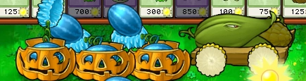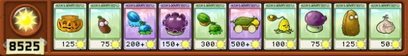 (这里以经典八炮为例)首先是选卡环节:大蒜(必不可少)、冰瓜、西瓜投手、高建国、玉米投手、玉米加农炮、忧郁蘑菇、大喷菇、咖啡豆(这7张卡用于搭梯结束后完善阵型)、南瓜头(必不可少)。