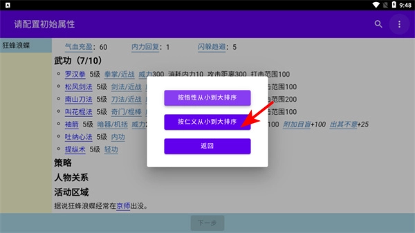 在界面中,点击“按仁义从小到大排序”等选项即可整理武功列表,这是优化战斗策略的关键操作,排序后能更便捷地选择适合当前战局的武功。
