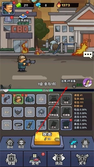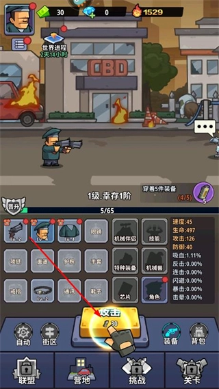 点击敌人进行攻击,推动末世冒险的进程,从而获取装备和资源。