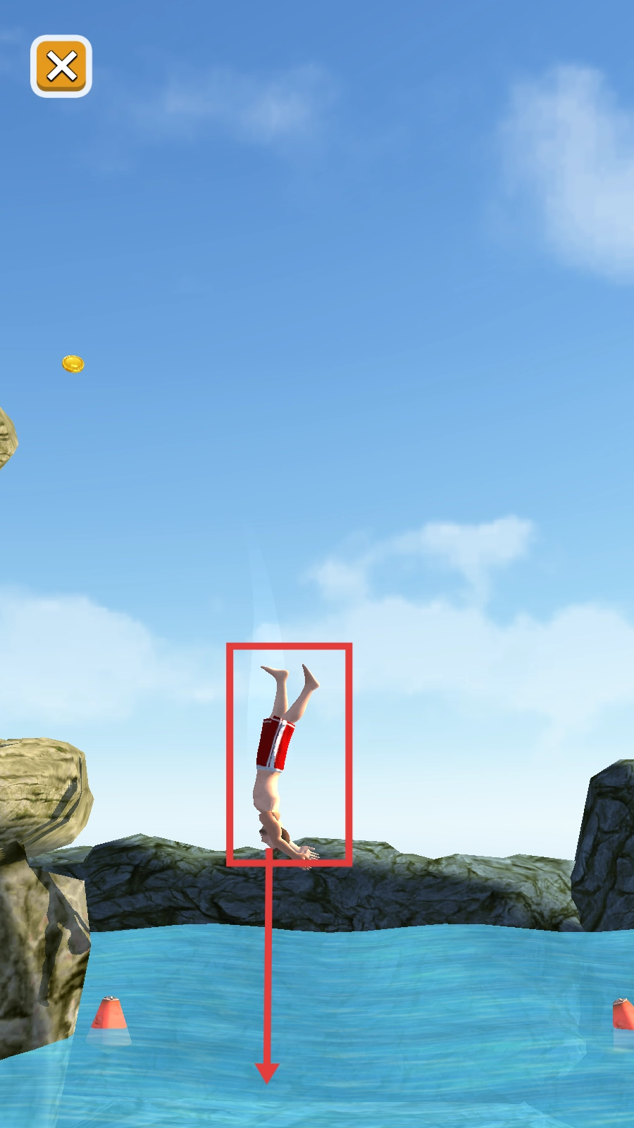 控制角色做出翻转动作,准确跳入水中,通过提高翻转的质量来赢得更多的金币和分数。