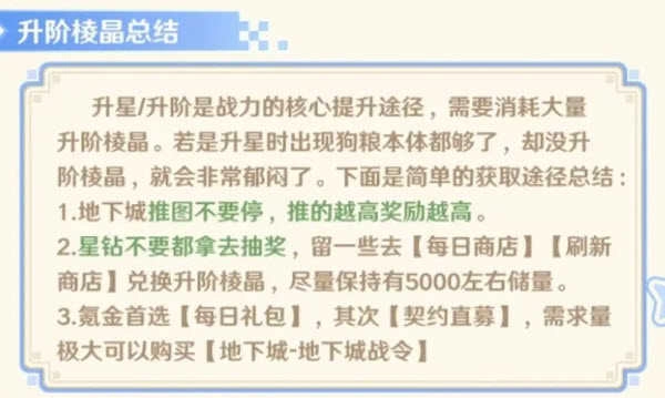 一、说明:升星与升阶是提升战力的关键手段,过程中需要大量升阶棱晶作为材料支撑。