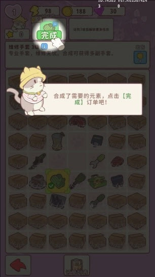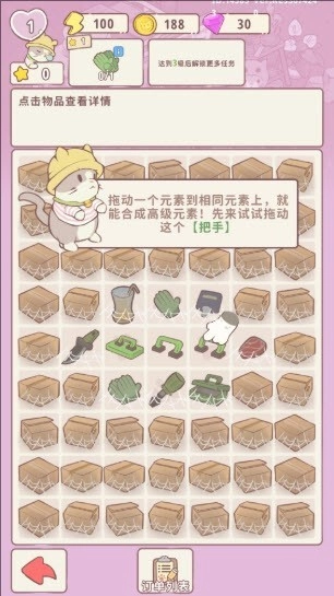游戏沿用了经典的合成机制,玩家只需拖动相同道具,即可合成更高等级的道具。 2. 带有“闪电”标识的物品支持拆卸操作,这类物品中通常藏有我们所需的道具。