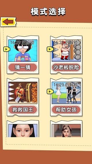 2.设有猜一猜、沙老板脱险、救救国王、帮助女孩等多种模式,玩家可自由选择。