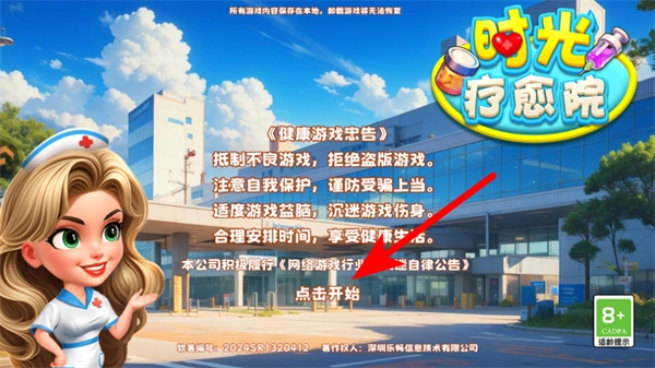 1、启动时光疗愈院游戏,点击界面上的开始按钮,进入游戏关卡。