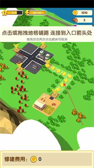 4、点击或拖拽地格来铺筑道路,使其连接到入口箭头的位置;若要取消已铺设的道路,只需在道路处于高亮状态时再次点击即可。