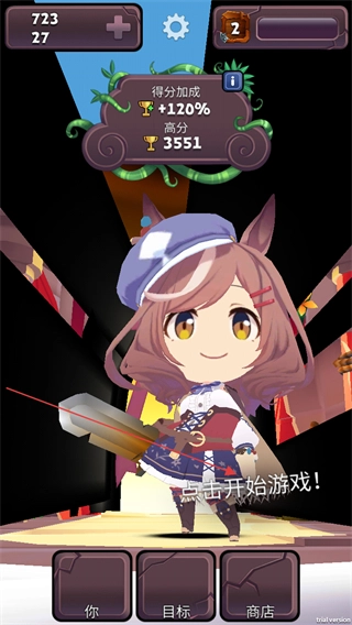 1、这个界面是游戏的启动页面,上面显示历史记录的最高分数为3551,点击屏幕的任意一处就能开始游戏并进入游戏界面。