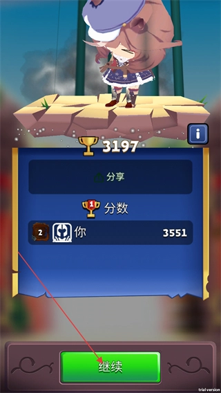 4、此为游戏的结算界面,呈现了本次的得分情况,点击继续按钮就能返回游戏流程。