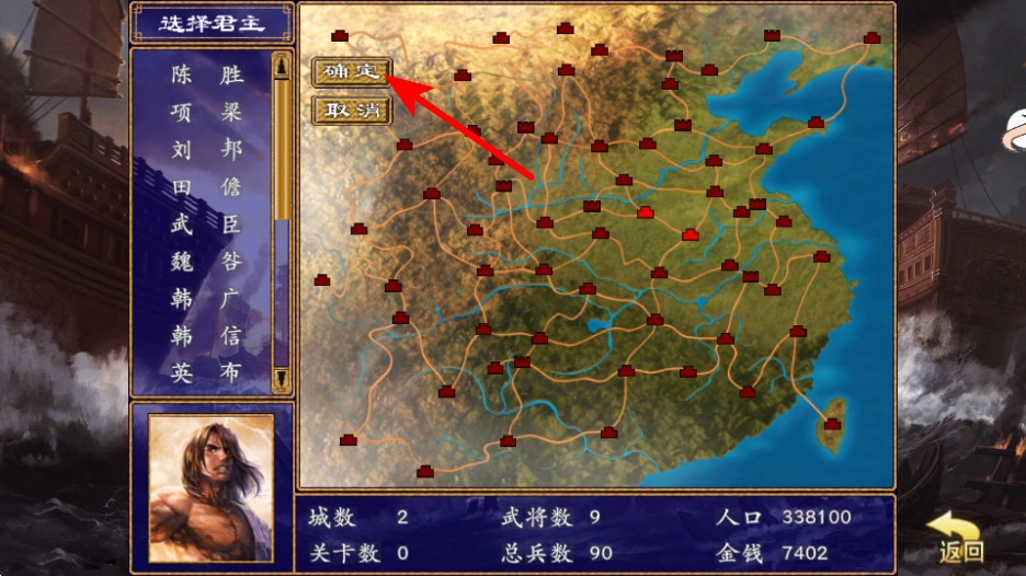 2、选定君主后点击确定按钮,此操作用于确认君主选择,点击完成后便能进入所选势力对应的游戏地图界面。