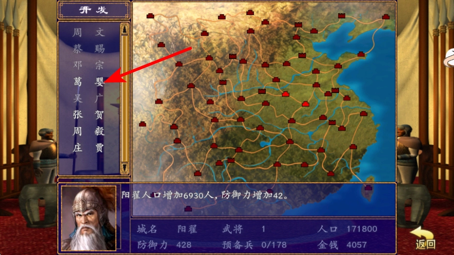 3、在开发界面点击对应的武将,这一操作是指派武将进行城池开发,完成后能够提升城池的人口数量或防御能力。