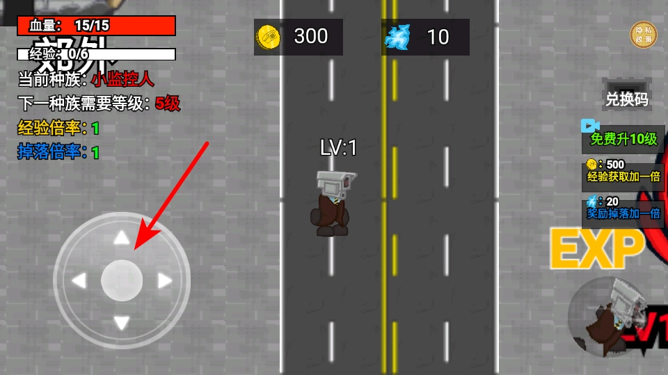 3、操作箭头所指的摇杆,这是控制监控人移动的核心操作,拖动它能让角色朝着目标区域前进,从而获取经验与资源。