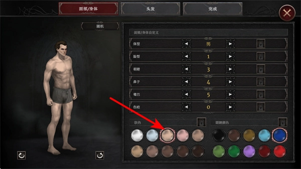 2、在角色创建界面,通过红色箭头对应的肤色选项,可选择你偏好的角色肤色,完成角色外观的基础自定义。