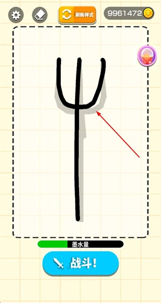 1、在绘图界面画出三叉戟造型的武器,等墨水值积满后点击“战斗!”按钮,就能进入对战环节了。