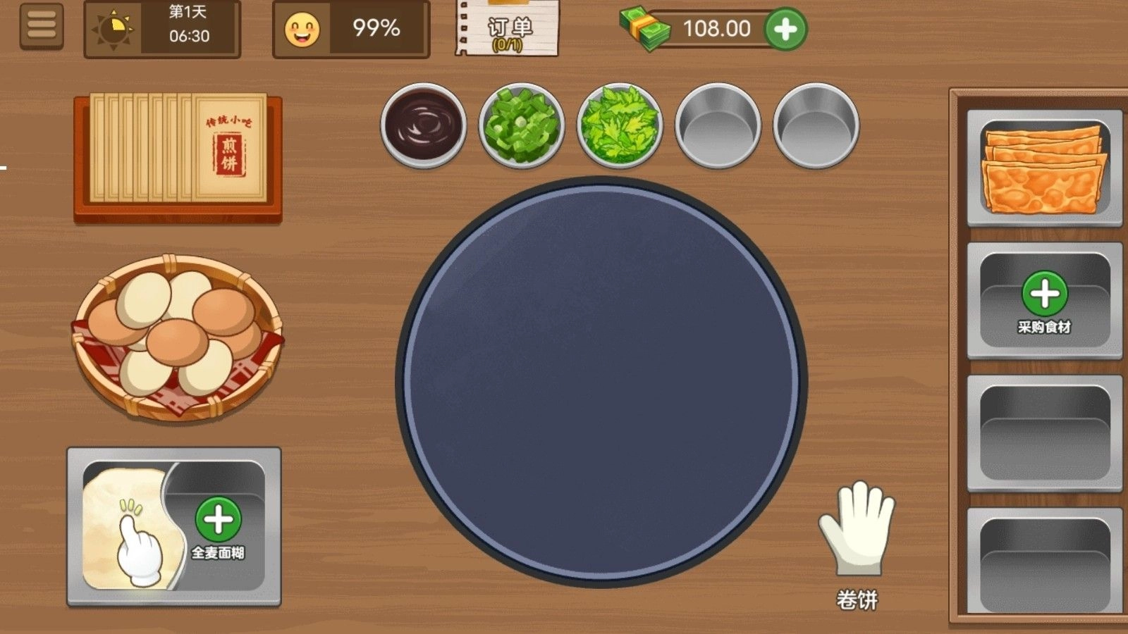 1、日常经营时,依据顾客的订单从冰箱里取出相应食材,按照步骤完成煎制、卷制等制作工序,保证能按时把美食交付给顾客,从而获得金币收入。