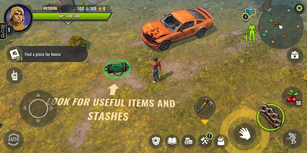 游戏启动后,先去收集几根树枝,用它们做一把简单的武器,把家周围的丧尸清理干净。之后去附近的车辆那里找刀具之类更好的工具,再铺几块地板——这是系统任务,得完成了才能走出初始区域。离开初始区域后,能看到左右两边地形不一样,左边是石头地面,右边则是树林。
