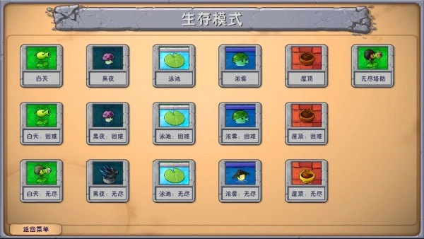 包含白天、黑夜、泳池、迷雾、屋顶场景的普通与困难关卡,以及泳池无尽模式和塔防无尽模式