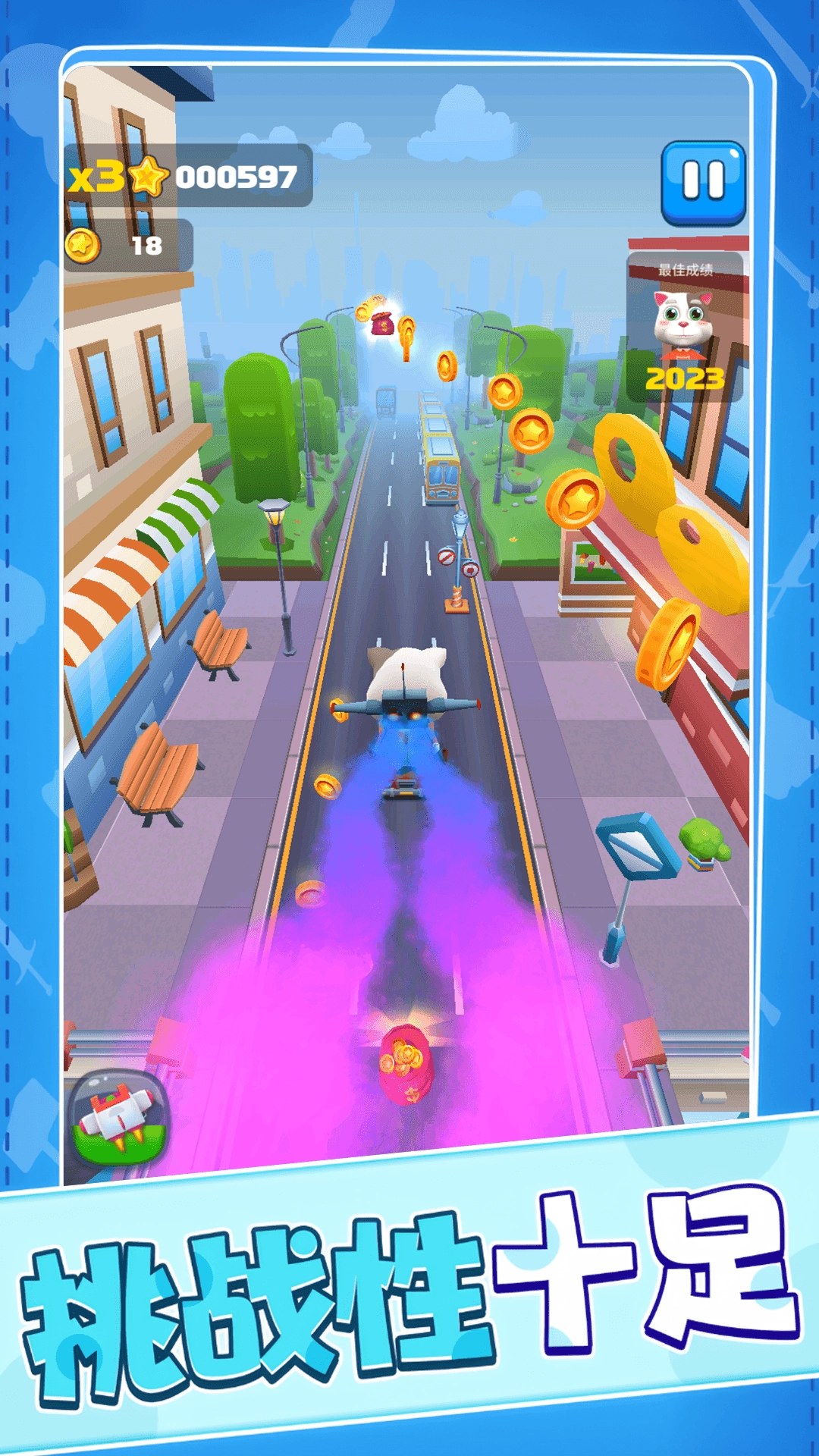 控制小猫咪奔跑,滑动屏幕就能让它做出跳跃、翻滚的动作,避开路上的各种障碍,比如车辆和陷阱之类的。