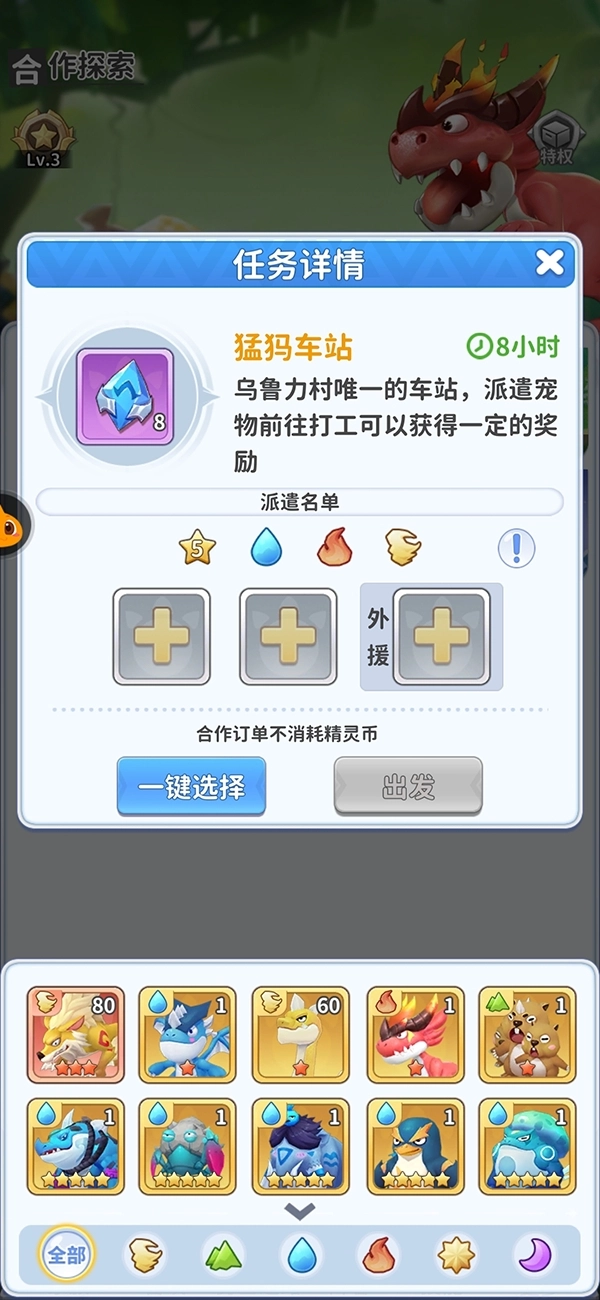 和单人探索模式大体相同,不过得额外安排自己好友或家族成员的宠物充当探索外援,合作订单不会消耗精灵币。