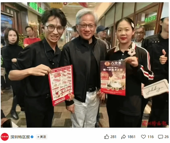 离店前,黄仁勋应店员请求合影留念,还在餐盘上签了名,过程中他多次夸赞“深圳的牛肉很新鲜,味道很不错”,并且说以后会再来光顾。
