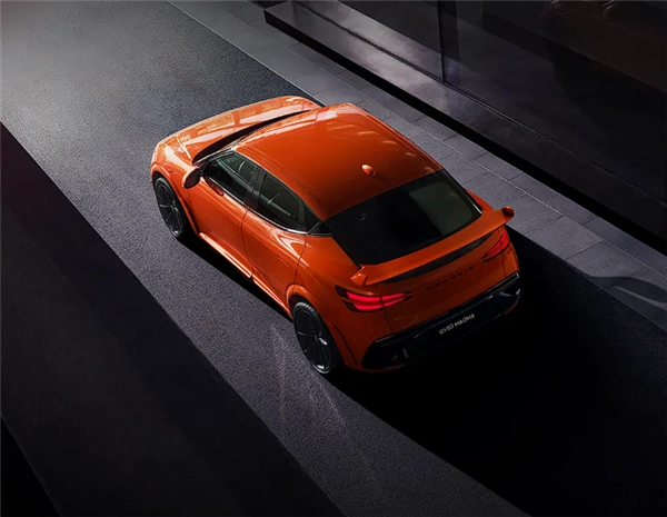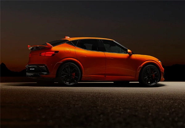 侧面造型极具张力,顶线与窗线在C柱处交汇,搭配充满战斗气息的橘黄色车漆、红色刹车卡钳、熏黑轮圈以及大尺寸固定式扰流板,营造出格外锐利的视觉感受。