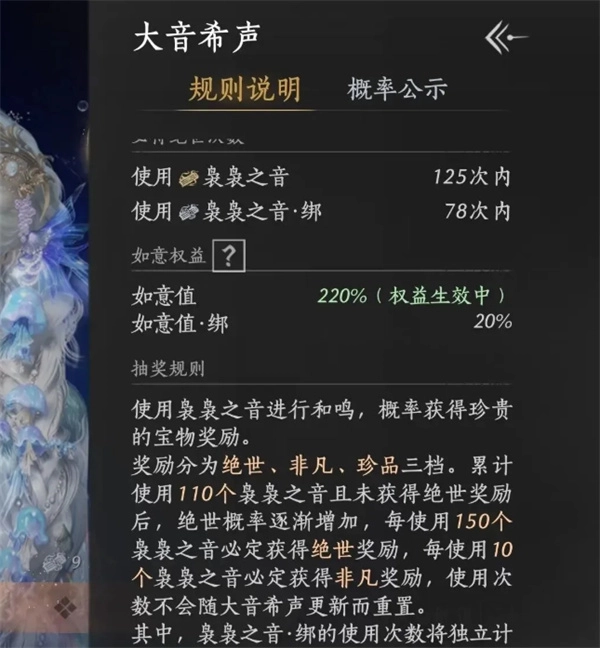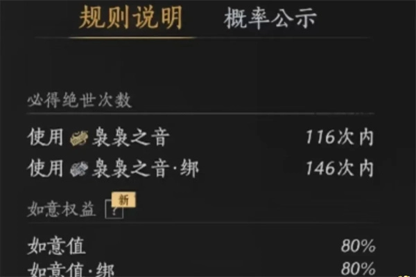 2、大家最关心的仍是怎样用最少的袅袅之音去争取抽中彩蛋的机会,这事儿大多还是得看如意值——它决定着你下一次抽中彩蛋的概率。网上那些抽了几十次就中彩蛋的玩家,通常都是把如意值拉满了的,只有极少数幸运儿才不用依赖如意值。