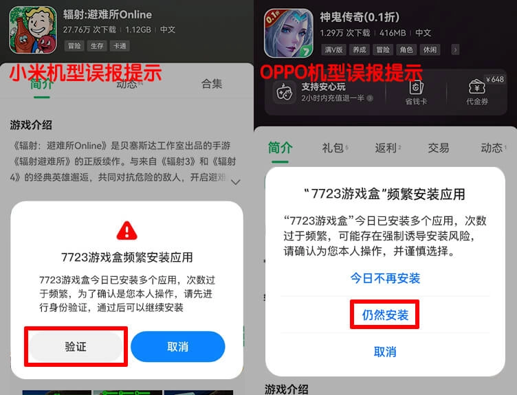 答:该情况的出现是小米/红米、OPPO手机对外部其他应用商店进行限制所导致的,这属于手机自身的系统限制要求,并非客观事实。经工作人员验证,在使用其他第三方APP下载安装游戏时,当天第二次安装也都会出现该提示情况。要是小七在使用7723游戏盒安装游戏时遇到该提示,可以不用理会系统的误判描述,按照以下方法操作就能正常安装啦:
