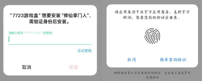 答:使用OPPO、一加手机的用户,在通过7723游戏盒下载安装游戏的过程中,可能会遇到需要验证账户密码或指纹的提示(见下图)。这一现象是手机系统对外部第三方应用安装行为的限制所导致的,属于OPPO系列手机自身的系统限制规则,密码验证环节无法跳过。大家可以按照以下方法尝试解决: