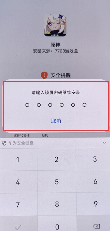 6-3:华为手机下载安装应用时需要验证密码或指纹 答:部分华为机型在通过7723游戏盒下载安装游戏时,会弹出验证账户密码或指纹的提示(见下图)。这是华为系统对外部应用软件的限制所致,属于手机自身的系统要求,该验证无法取消。建议将锁屏密码设置为便于操作的形式,这样后续安装时直接用锁屏密码验证即可~