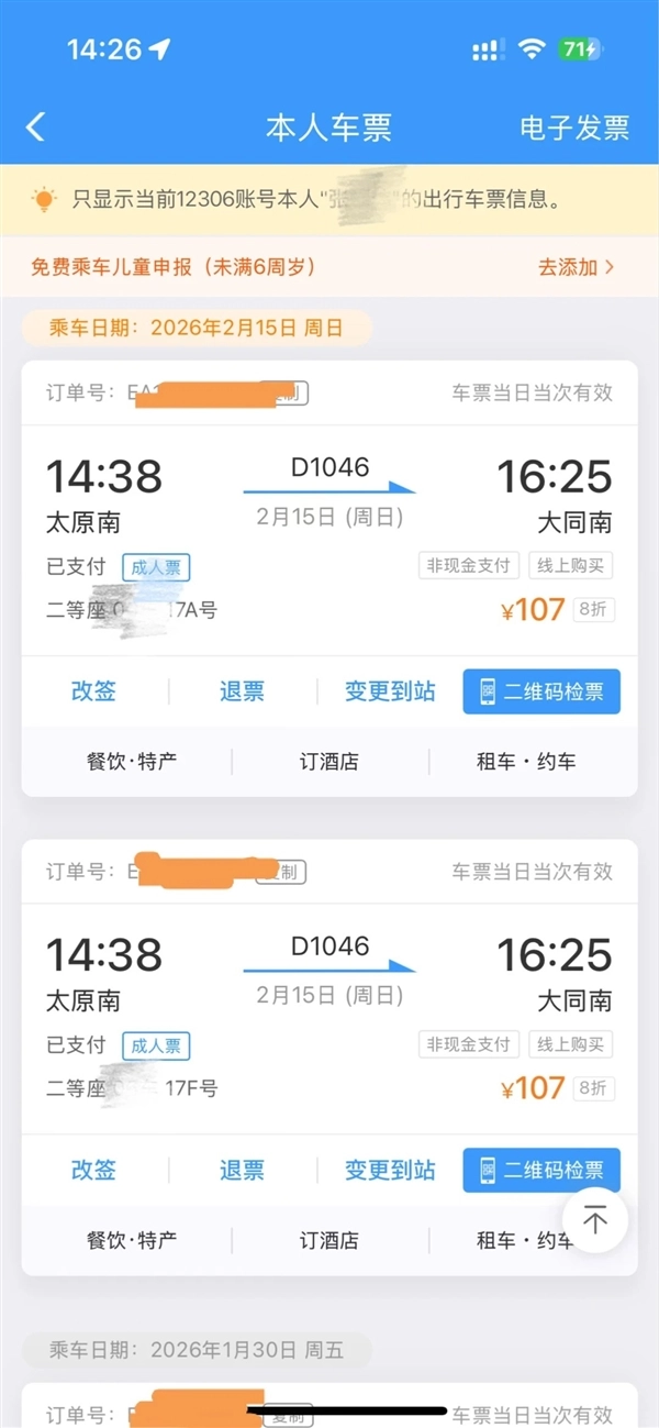 根据网友分享的订单信息显示,他们购买的是D1046次列车车票,该趟列车于14:38发车,往返于太原南站和大同南站之间,两张车票的座位号不一样。