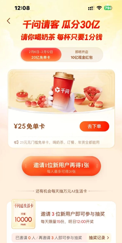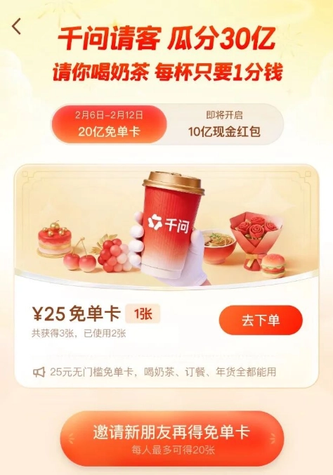 千问30亿红包活动正火热进行中,带来20亿免单卡与10亿现金红包的双重福利。不少用户还不清楚如何领取红包以及在哪里查看活动,其实只需更新千问APP并完成实名认证绑定支付宝就能参与。领取免单卡可享受奶茶、外卖、年货等优惠,邀请好友、完成任务、观看春晚还能抢现金红包,满0.5元即可提现。