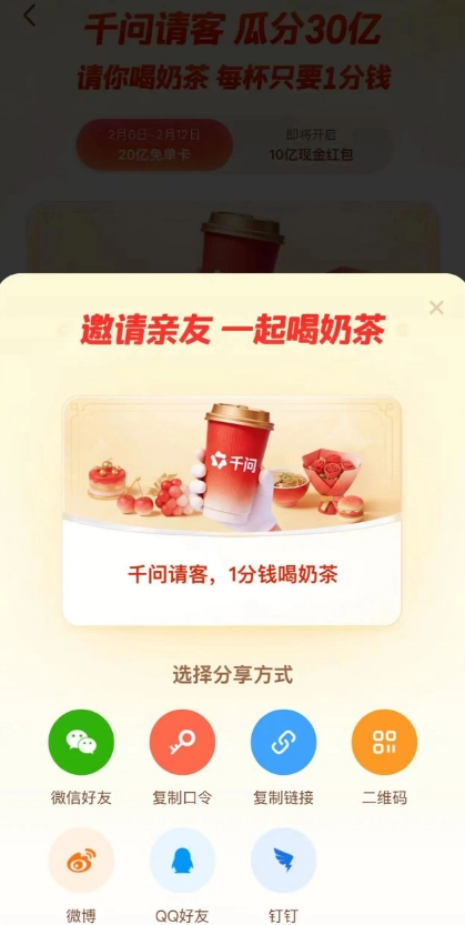 3、消费返现活动:在千问平台下单奶茶、外卖、年货等商品,完成支付后有机会获得随机金额的返现