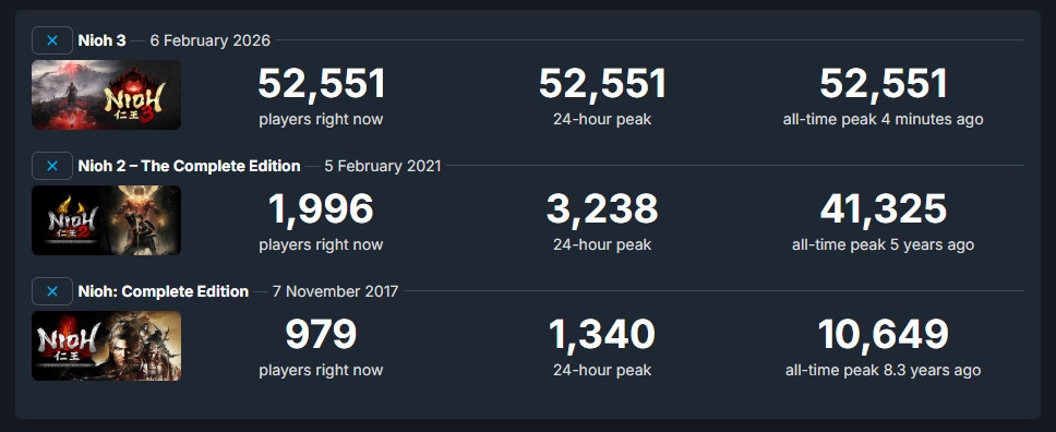 另外,《仁王3》PC版的热度在系列里显然是最高的,首发当天Steam在线峰值就突破了5万,已经超过了前作《仁王2》。目前这个数据仍在增长,而且明天就是周末了,估计《仁王3》的Steam在线峰值能达到7到8万左右。