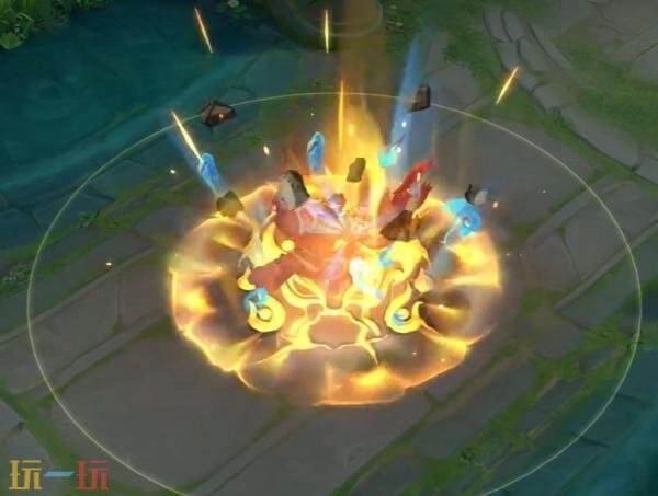 被动技能:能量满蓄,盘古身后凌空幻化出一双手持英歌槌的巨臂。每次敲击皆伴随纹样与火焰飞旋而出。