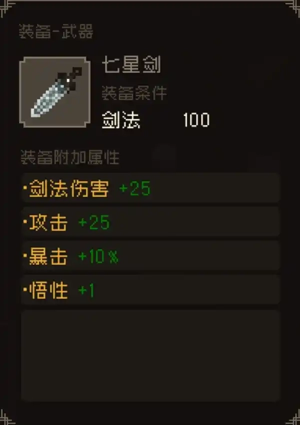 七星剑属于高品阶武器,对于选择剑法路线的玩家而言,它是必备之物。玩家获取这把武器的方式是在破庙中与师兄进行切磋,只要能获胜,便可得到七星剑。