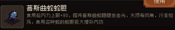 在游戏里,玩家只要击败菩斯曲蛇,就能从其身上获取蛇胆。玩家食用蛇胆后,内力可增加80。