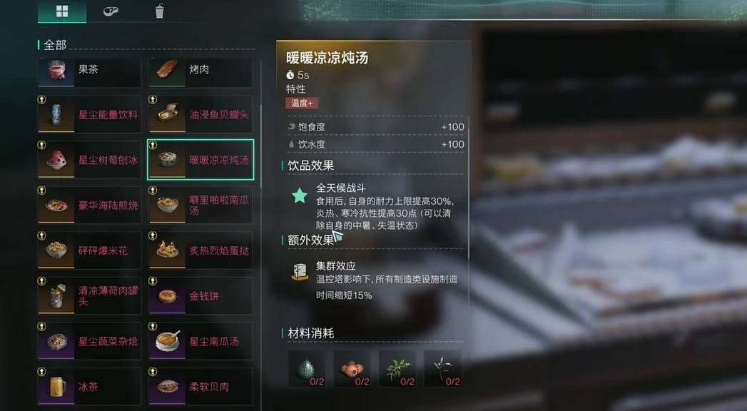 若想不被冻死,你得精心筹备一番。首要的是,料理绝对不可或缺。比如“盐烤火刺果”这类食物,能提升寒冷抗性,食用后你便能在低温环境中多停留一阵子。又如烤肉,同样是很好的选择,能够增强你的抗寒能力。要是你着实不想在外面被冻成冰块,出发前吃些这类料理,效果会显著得多。