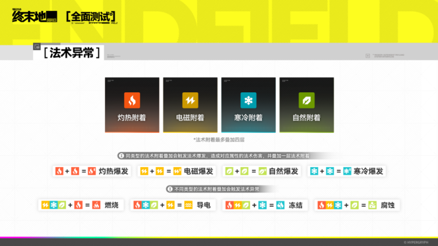 法术异常机制调整如下:新增「法术附着」层数设定,最多可叠加至4层。当对敌人重复施加同类型的「法术附着」时,将触发「法术爆发」并累积层数;若后续施加不同类型的「法术附着」,则会清除之前所有已有的「法术附着」,并根据附着类型组合产生效果各不相同的法术异常状态。