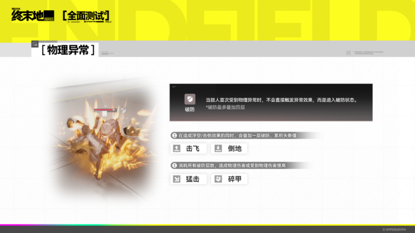 物理异常:新增「破防」层数机制(最多可叠加4层)。「击飞」和「倒地」效果可以叠加「破防」层数;「猛击」和「碎甲」效果可以消耗「破防」层数,并触发不同的强力效果。