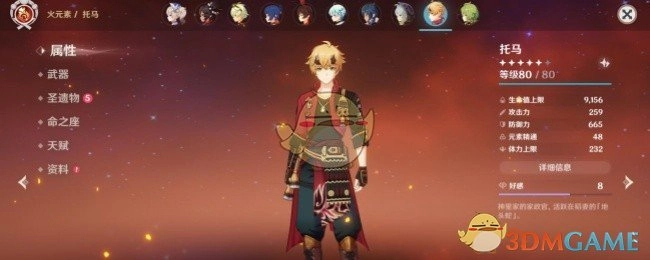 如果选择烈绽放打火机角色,托马需尽量提升角色等级,同时堆叠充能与精通,生命值属性相对没那么重要。
