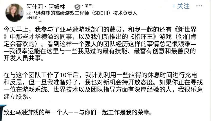 与此同时,亚马逊游戏旗下一款已开发两年的《指环王》IP大型多人在线游戏(MMO),其项目负责人透露自己及团队已遭裁员,该项目恐将就此搁置乃至夭折。