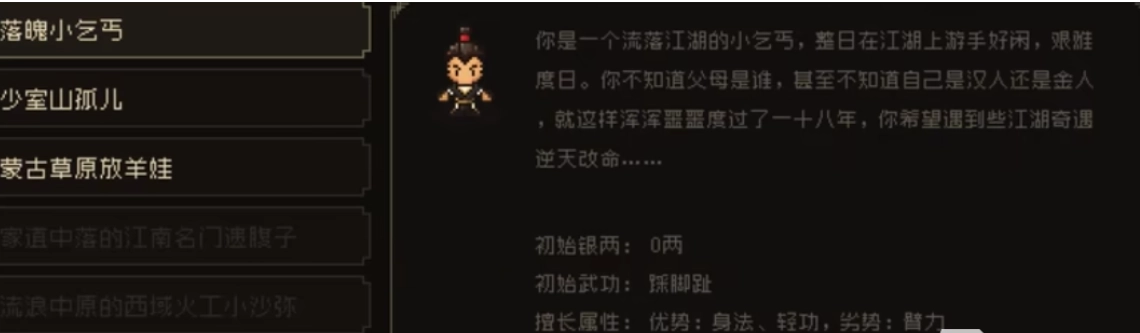 孤儿出身赋予他超乎常人的臂力,这是一大优势。然而,其出身也带来明显弊端,身法并非特别出色。总体而言,孤儿是个综合能力较强的角色,悟性与潜力都极为出色,更适合走特殊流派。若玩家选择孤儿出身,建议优先习得佛门绝学狮吼功。狮吼功在前期或许作用有限,但后期能够实现转化。